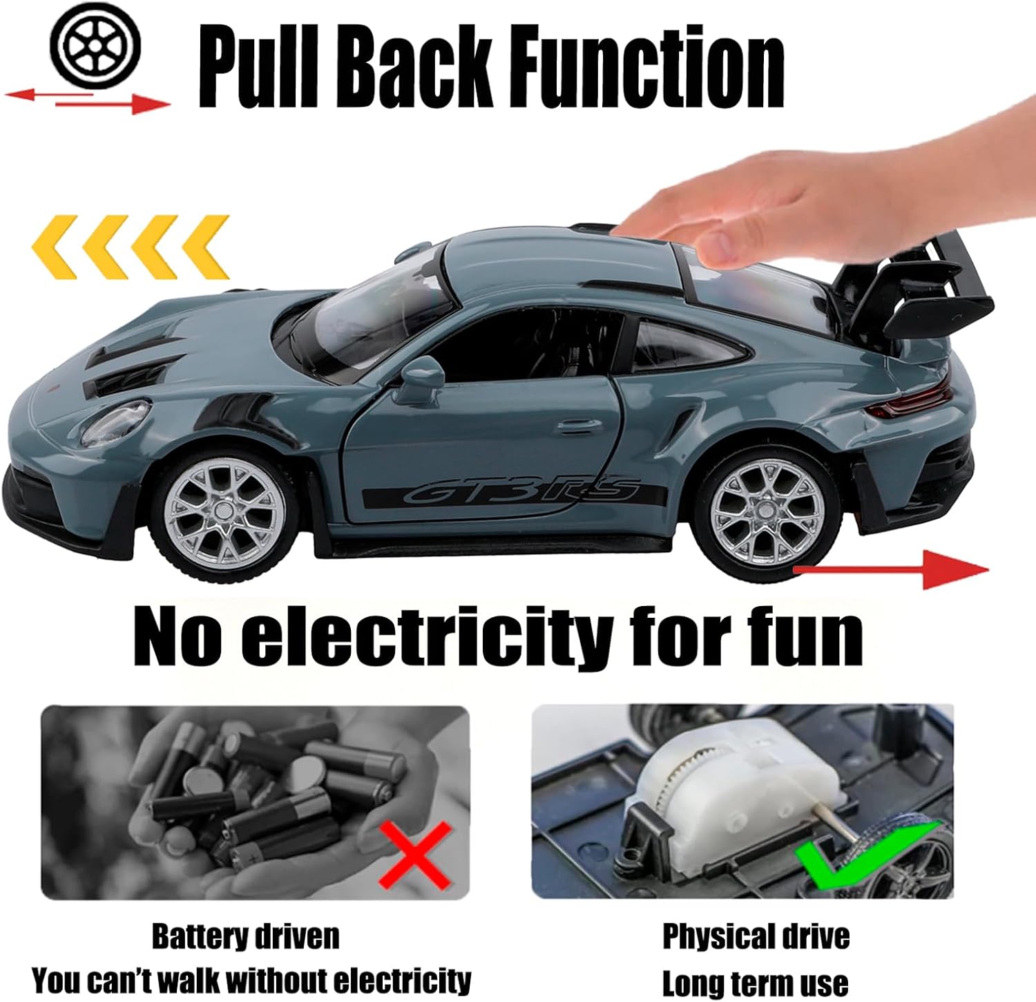- Function:No batteries are required, but the vehicle has a powerful pull back feature. Simply pull it back, then release your hand, and the car will go for a long distance. The doors may be opened to view the whole inside of the vehicle. So appealing to children and collectors alike.