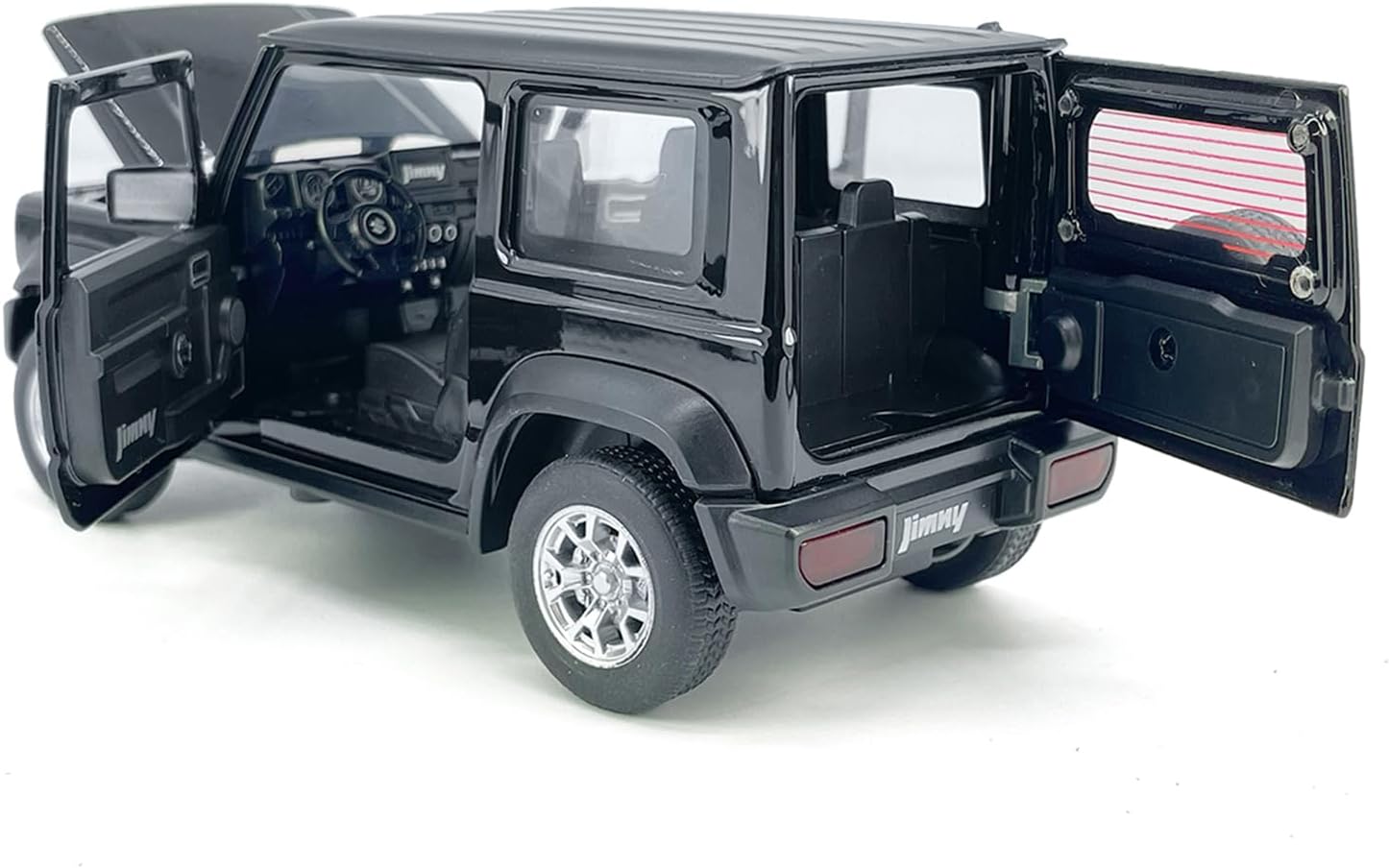 - [Interactive Functions] Equipped with a pull-back mechanism, opening doors, hood, and trunk, as well as light and sound effects, this 1/24 Jimny model car offers immersive and engaging fun.