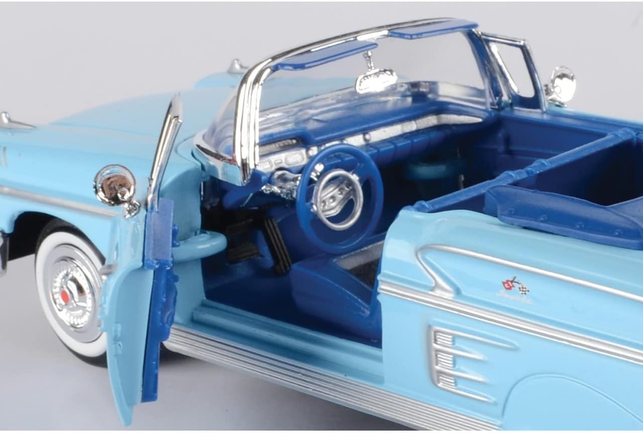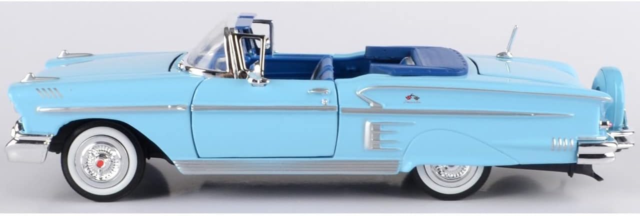 Precision Diecast CollectibleHood, Doors & Trunk OpenDetailed V-8 Engine Under the HoodFull Interior Detailing with Tri-Tone SeatsOptional Continental Spare Tire Out BackGleaming Chrome Bumpers, Grille & TrimSmooth Rolling Rubber TiresSteering Wheel Controlled Front Wheels1958. Ike was president, Elvis was king, and Chevrolet stunned American with the introduction of the first Impala. Bold and daring, sales of Chevy’s top-of-the-line Impala skyrocketed making it America’s best-selling car for over 15 years! Loaded with features from bumper to bumper this precision diecast includes a big block V-8 under the hood and a continental spare out back. Deluxe interior, triple taillights and tons of gleaming chrome complete this Fifties classic!
