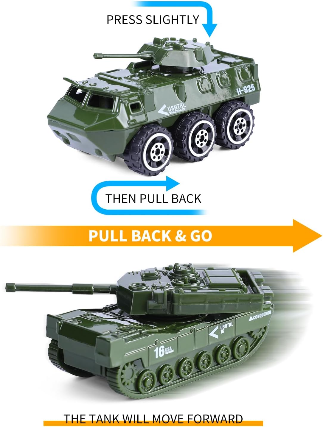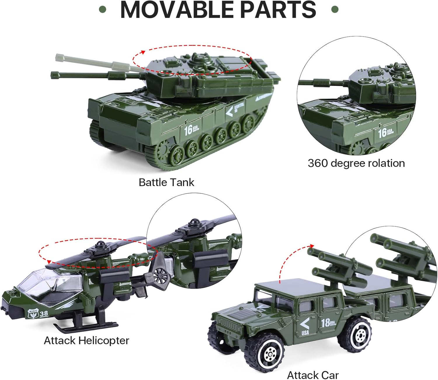 - GOOD SIZE: Die-cast military vehicles,realistic detailed,joints can rotate, measure approx 2.7 inch.The military playset perfectly fit in kids' hands and pockets.