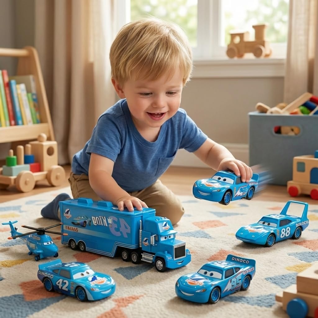 - Truck dimensions: 22 x 5 x 7 cm, Race car dimensions: 8 x 4 x 2.5 cm
