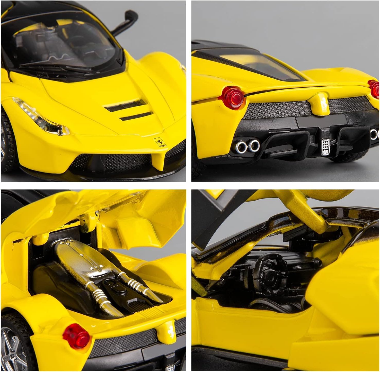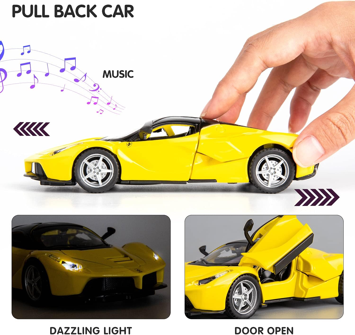 This model car has a pull back function, very exquisite. It has realistic lights and sounds. Both doors and the rear end can be opened. It is an ideal gift toy car for kids, also great to use for decoration.