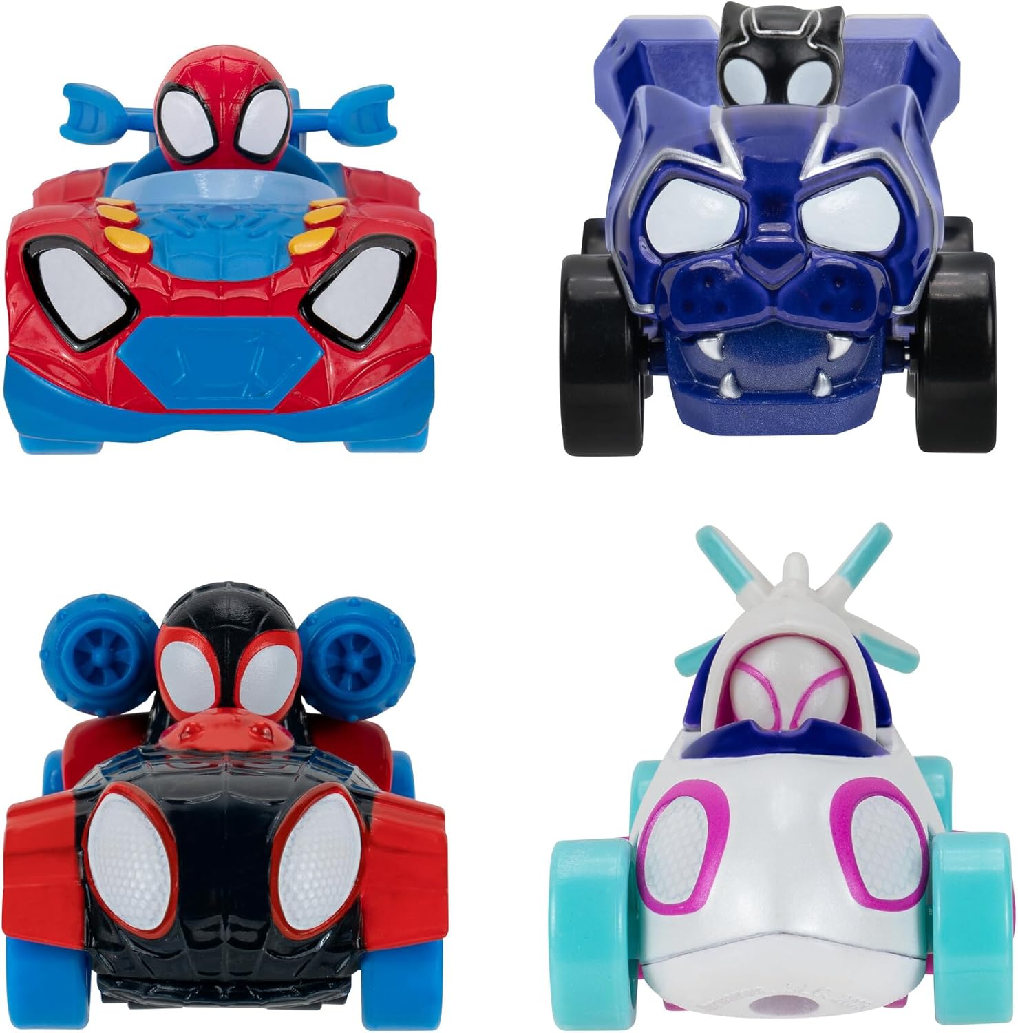 - Look out: here comes the ultimate squad: Spidey, Ghost-Spider, Black Panther, and Miles Morales: Spider-Man Amazing Metals 4 Pack die-cast vehicles.
