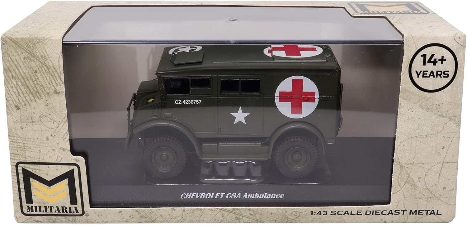 - The Motor City Classics Militaria Diecast Chevrolet C8A Ambulance is a 1:43 scale replica of the Canadian Military Pattern (CMP) field ambulance used by Allied forces during World War II. Painted in authentic olive-drab green, it accurately captures the design, markings, and proportions of the C8A, one of the most recognizable medical vehicles of the war.