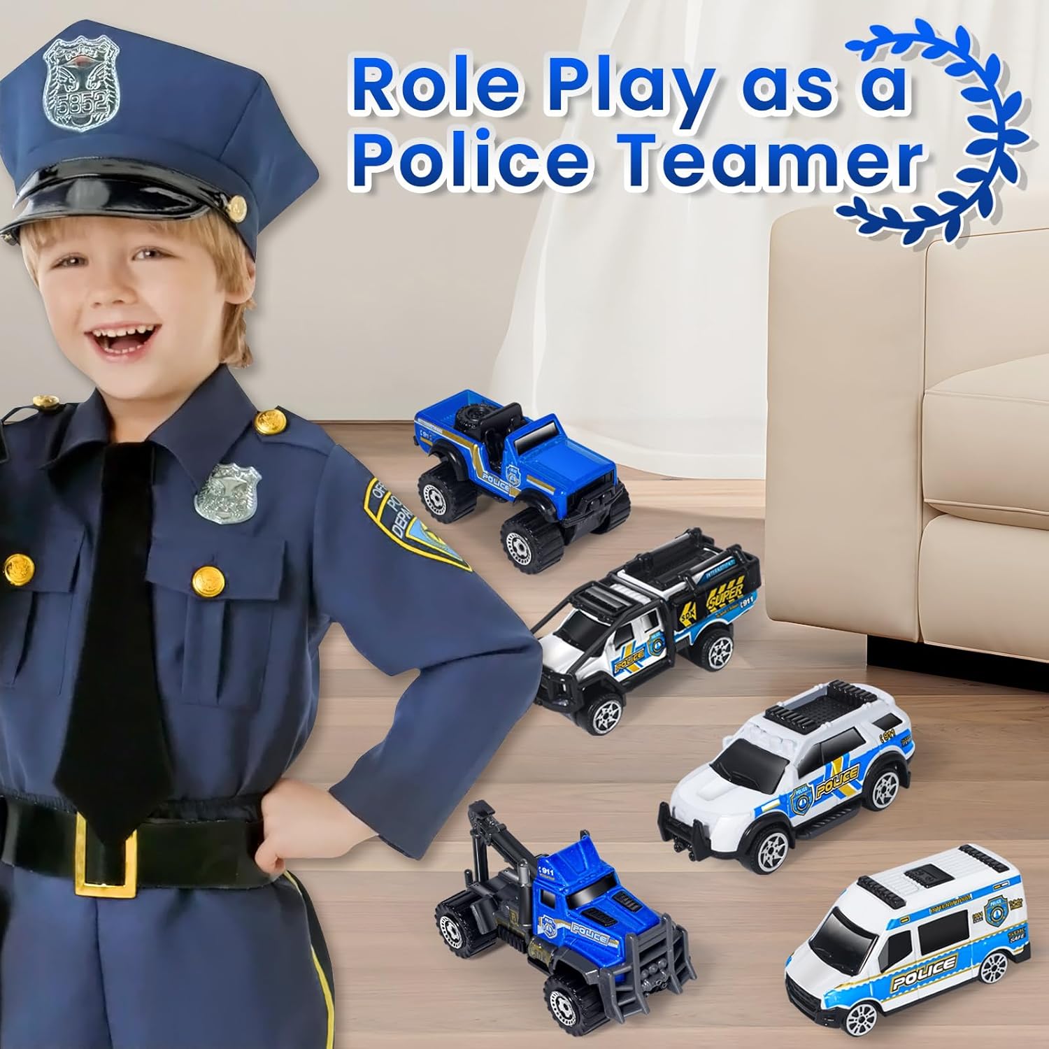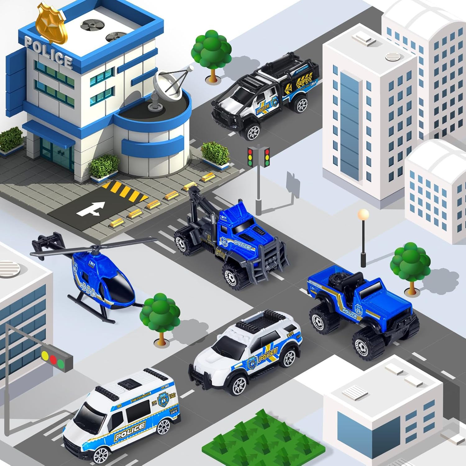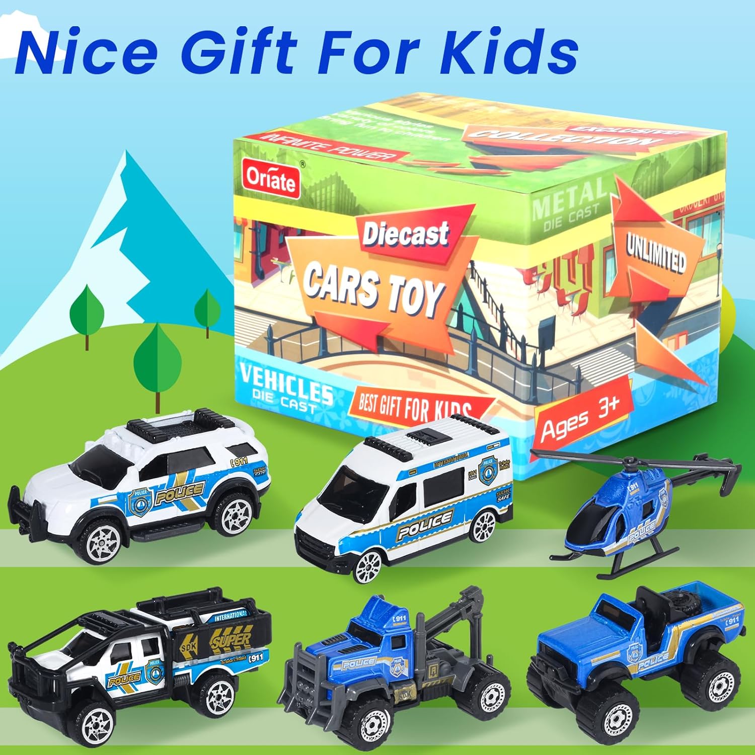 Oriate 6 PCS 1:64 Die-Cast Police Car Toys & Emergency Vehicles Set – Include Helicopter, Tow Truck Toy, ATV – Cake Topper, Police Cars Party Favors, Birthday Gift for Boys Girls Ages 3 4 5 and Above
