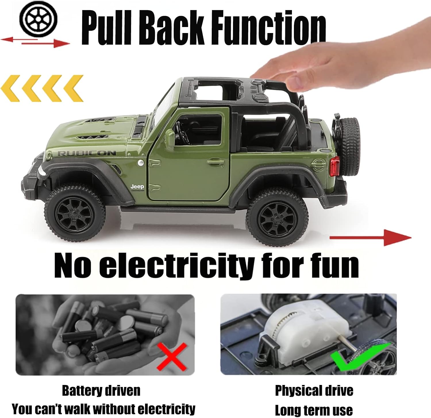 - High-Quality Materials:The JEEP die-cast car is made of zinc alloy,plastic parts and rubber tires,making it safe for children to play with.It features detailed interior and exterior trim, and is very sturdy.