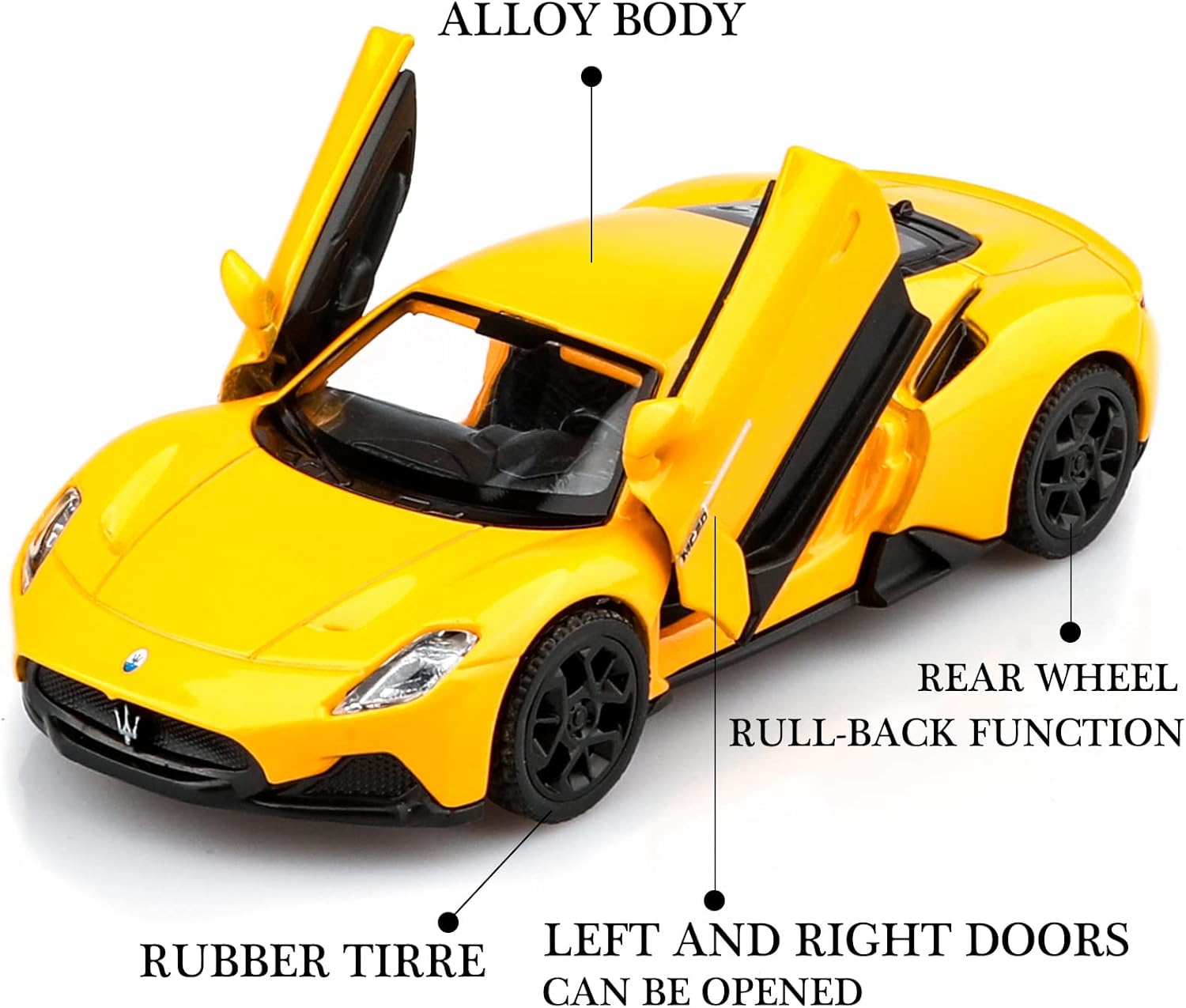 - High-Quality Materials:The Maserati die-cast car is made of zinc alloy,plastic parts and rubber tires,making it safe for children to play with.It features detailed interior and exterior trim, and is very sturdy.